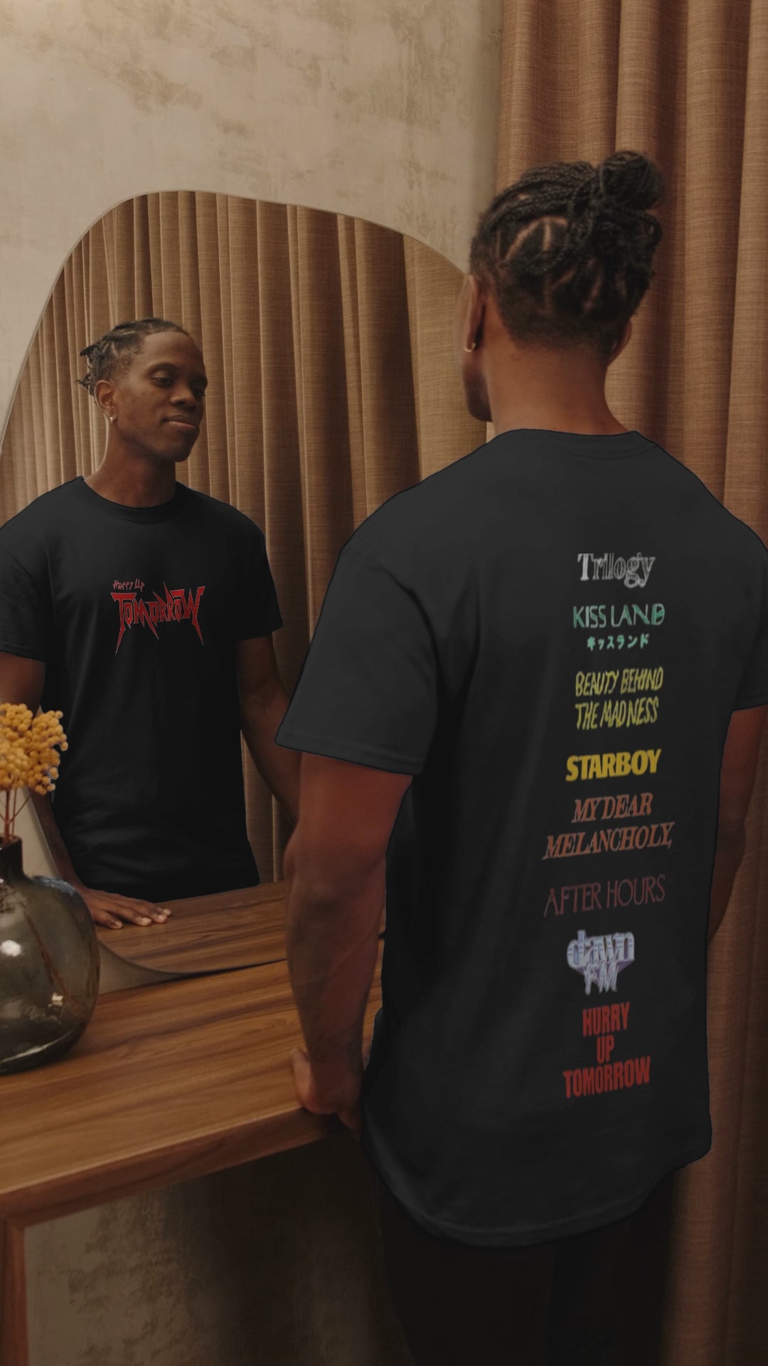 This limited-edition AMHYPE tribute T-shirt features a bold “Hurry Up Tomorrow” graphic on the front and The Weeknd’s complete discography timeline on the back — from Trilogy to Dawn FM, in unique fonts inspired by each album's aesthetic.